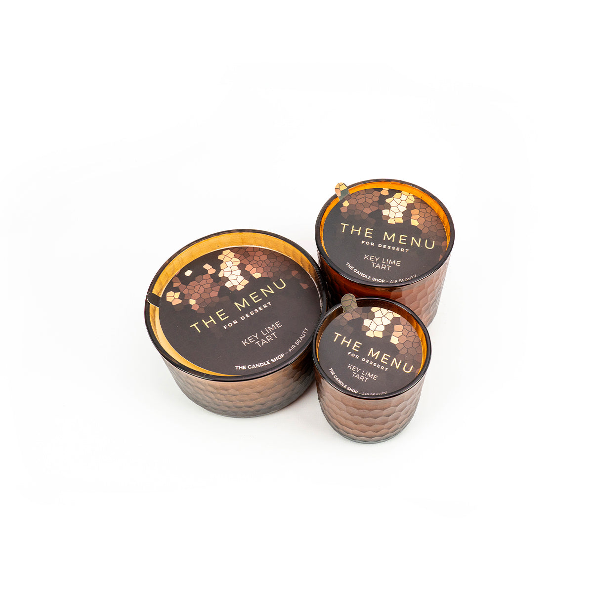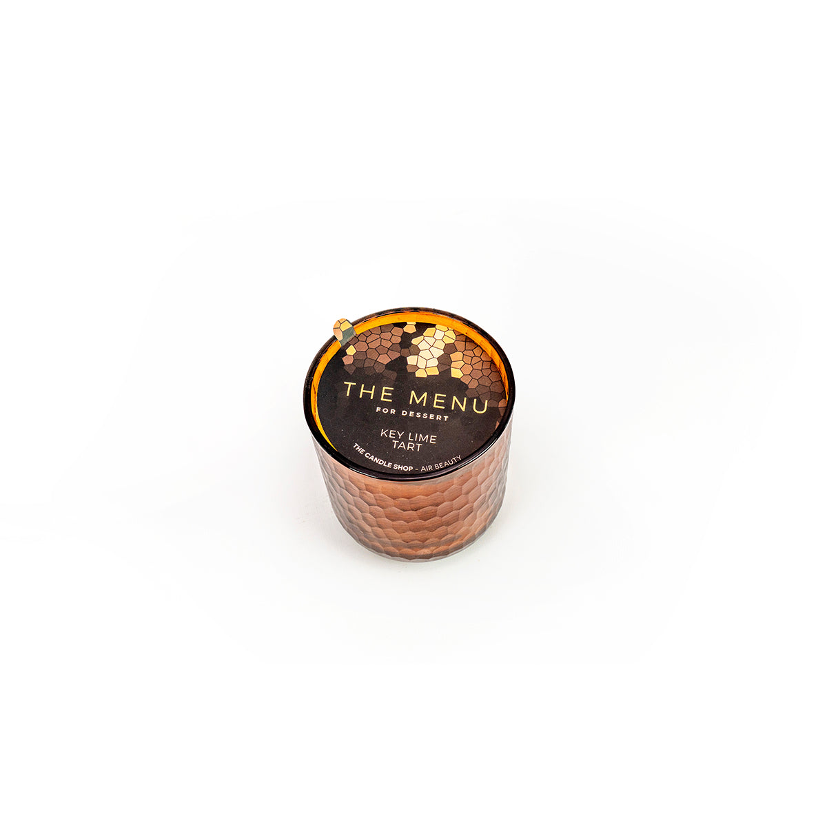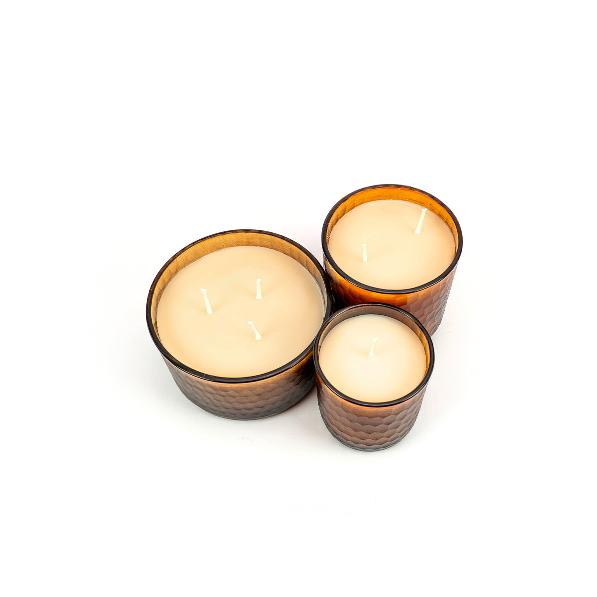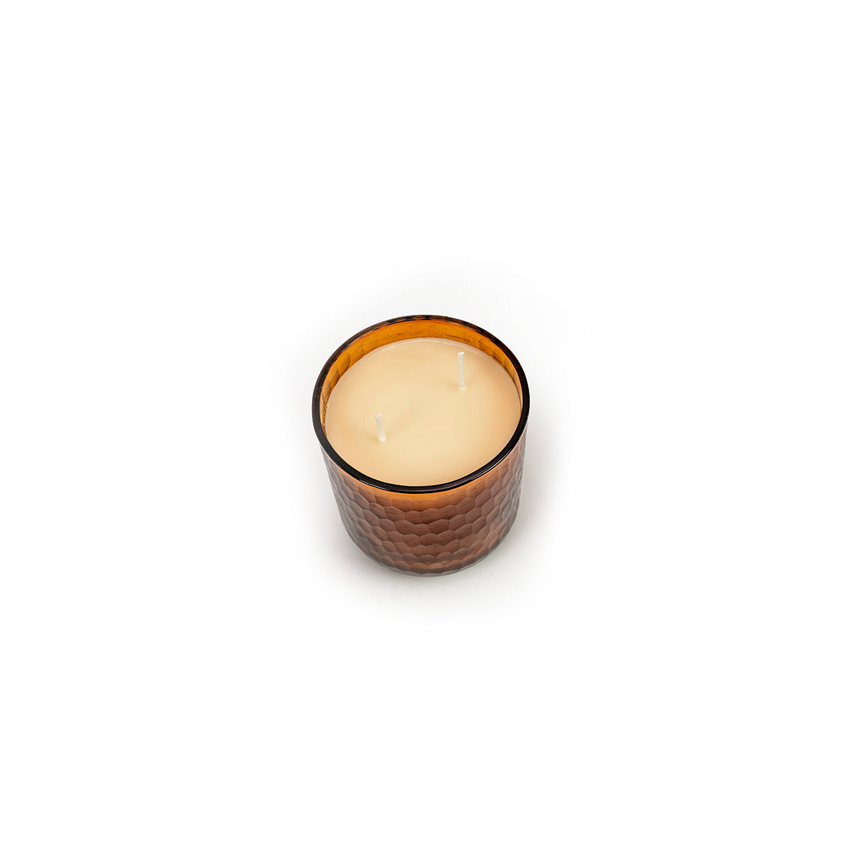 Vela en vaso de vidrio labrado y pintado en el interior, de 10 cm de diámetro y 10 cm de alto.